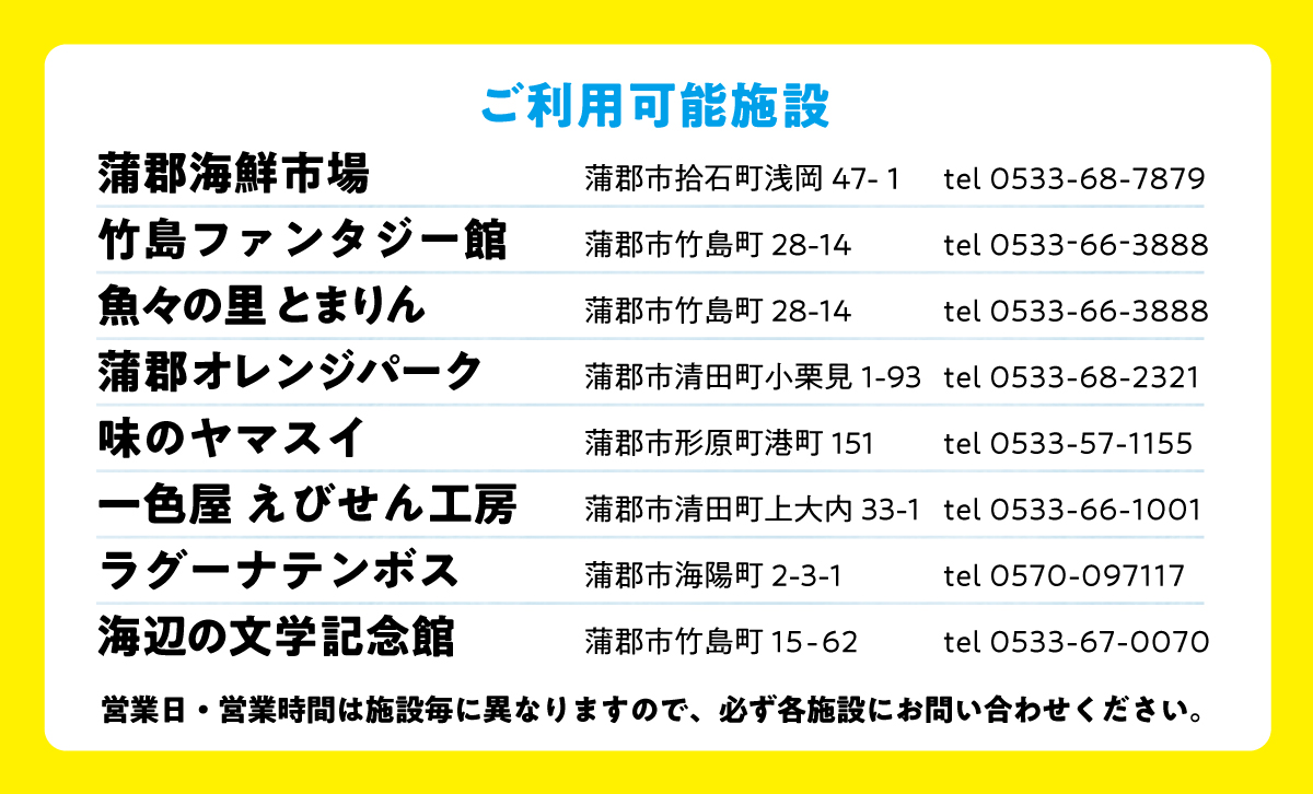期間中、蒲郡の指定宿泊施設に泊まると蒲郡市内の観光スポットや お土産店で使える500円券をプレゼントします。 この機会にぜひ蒲郡を満喫しよう!