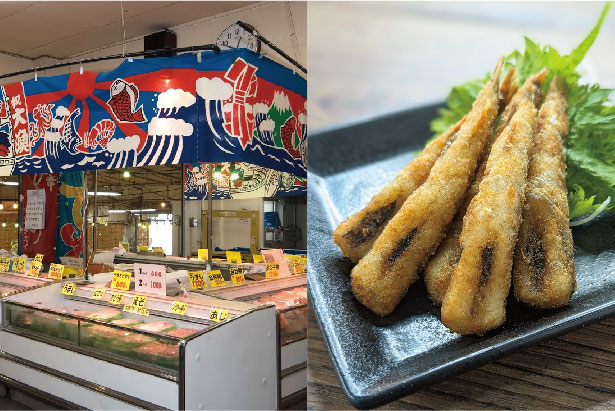 店内では名物のめひかりの唐揚げの試食もある。形原漁港に立つ、創業60年の老舗海産物専門店。活魚をはじめ、多彩に揃う商品の中でも、この店が発祥という蒲郡名物のめひかりの唐揚げ(1,490円)が大人気。※休みの場合あり